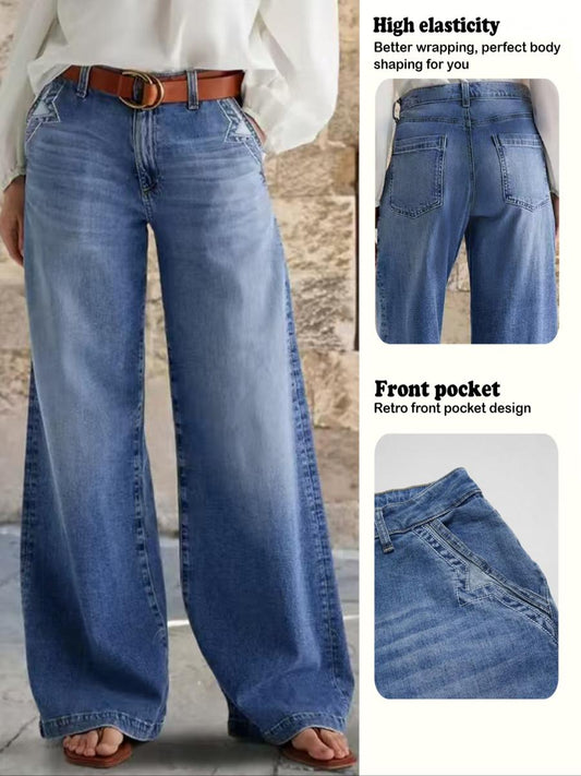 🎀Women's Denim Wide Leg Pants with Pocket Patches, Casual Loose Fit Jeans for Daily Wear, Comfortable Ladies' Fashion Bottoms👖