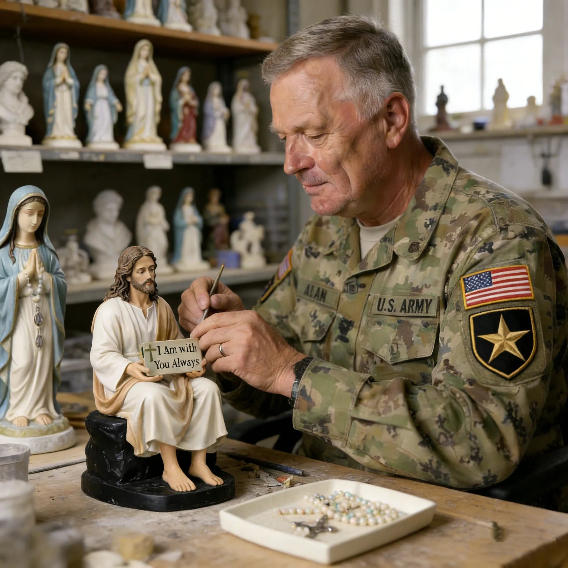 Jesus Holds a tablet inscribed with "I Am with You Always" A powerful scripture to banish anxiety and bring courage to your day.